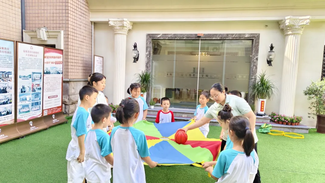 彩虹伞起伏如呼吸,营员们在"抛球"指令中精准卡位:太近则碰撞失球,太远难及落点。保持合适距离的默契,在游戏中悄然内化。大鲨鱼苏醒的瞬间,四散的身影与聚合的队形,将指令执行力化作动态的空间诗篇。